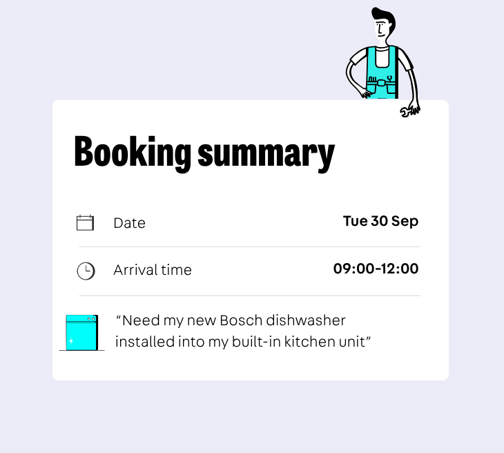 It used to be tricky to find a trusted tradesperson. But we’ve made the whole process seamless – from getting a quote, to securing your slot, to getting your new dishwasher installed.