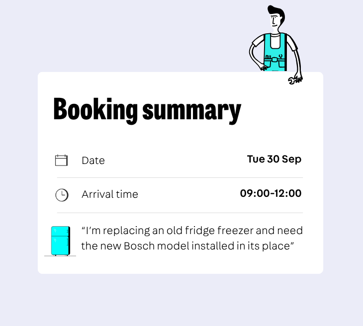 It used to be tricky to find a trusted tradesperson. But we’ve made the whole process seamless – from getting a quote, to securing your slot, to getting your new fridge freezer installed.
